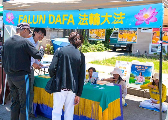 六月三日,旧金山湾区圣丽安珠市举办樱桃节摆街会,法轮功学员设置了真相摊位,向民众传播法轮功真相。