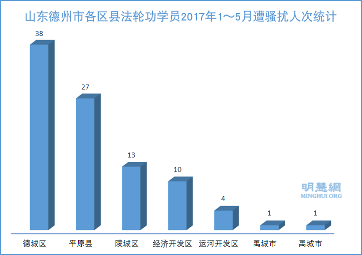 ![]() 图:山东德州市各区县法轮功学员2017年1~5月遭骚扰人次统计 |