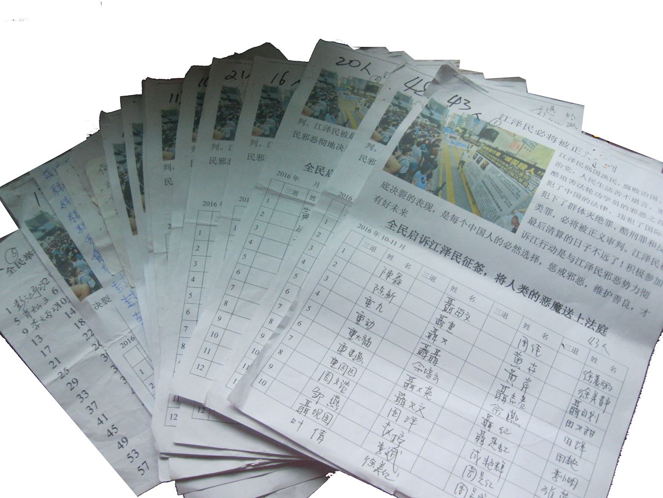 从二零一五年五月一日起,最高法院发起“有案必立,有诉必理”的新政策后,全国掀起了对江泽民的控告大潮,现在已经超过20万名受迫害的法轮功学员和他们的家属实名向两高控告迫害法轮功的元凶江泽民。山东省寿光市的法轮功学员从2016年开始,在集市上讲清法轮功真相并劝三退后,还告诉世人现在的诉江大潮,并且明真相的世人大多都在征签表上签字举报江泽民。