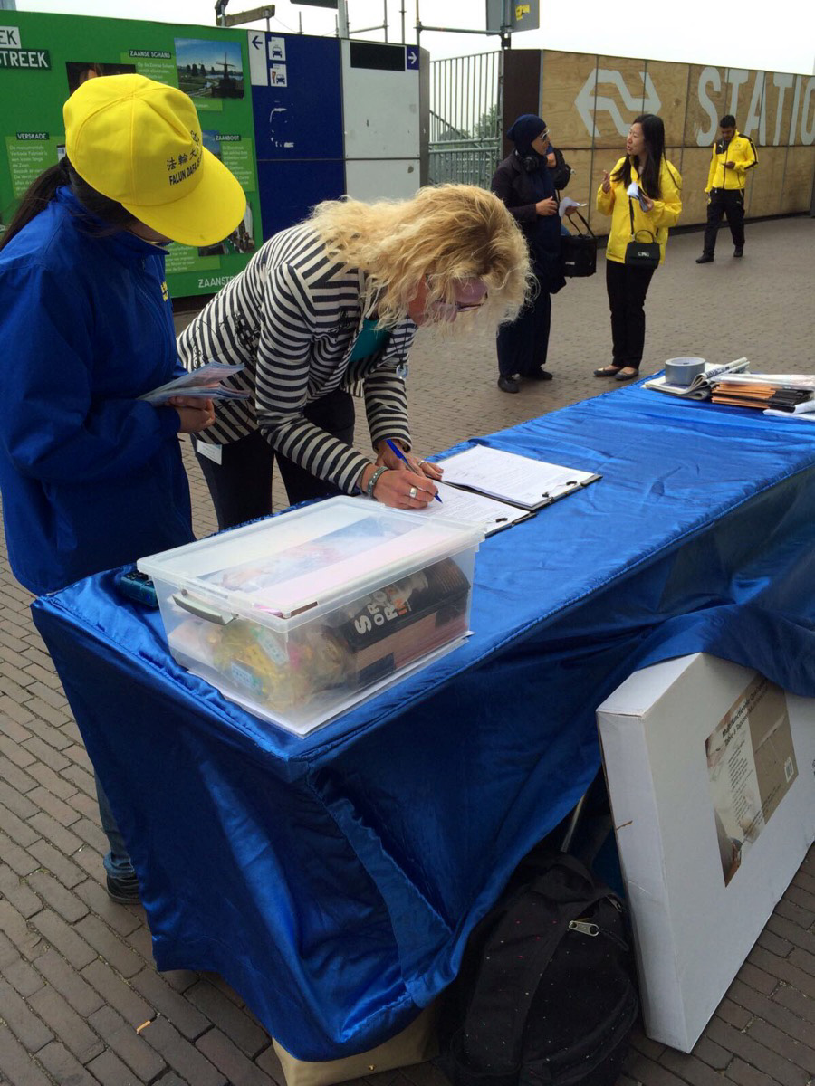 二零一七年五月三十日,张女士及部分学员来到Zaandam城市进行洪法活动并揭露她母亲彭杰被迫害的情况。当地广播电台及北荷兰日报也来到现场并对张女士进行了采访报道。