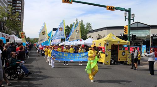 丁香节以游行拉开序幕,在众多游行队伍中,法轮大法的队伍格外醒目:法轮大法的彩旗迎风招展;学员们铿锵的腰鼓给观众留下了深刻的印象。腰鼓队员灿烂的笑容、和整齐的韵律,赢得了现场观众们的阵阵掌声和喝彩。