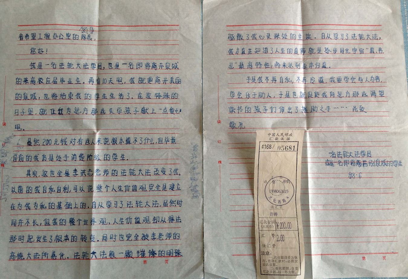 看着十九年前我那稚嫩的笔迹,真是百感交集,往事如同刚刚发生的一般又从新浮现在眼前。两百元钱确实不多,但作为学生的我深知父母的不易,日常生活的极其节俭,这笔钱可是我当时两个月的生活费。