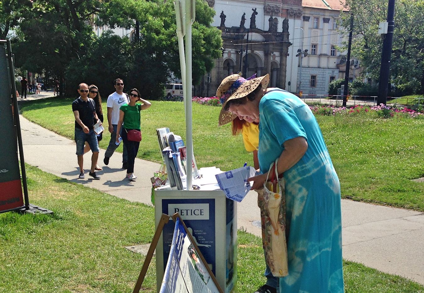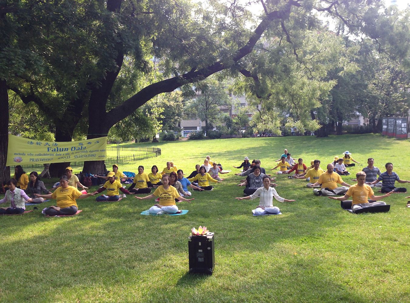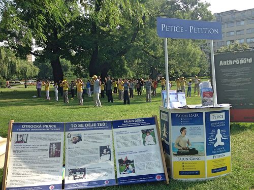 【明慧网二零一七年七月十日】二零一七年七月六日,法轮功学员来到布拉格市中心公园(Karlovo namesti)举办集体炼功,向当地民众和游客传播法轮功的真相。