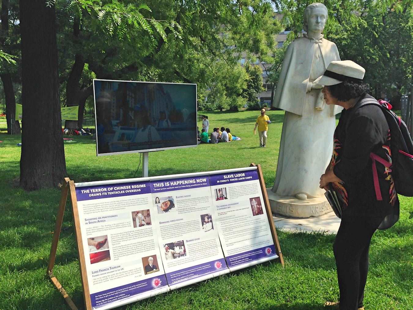 '图3:路人在观看展板和揭露迫害的录像片。'