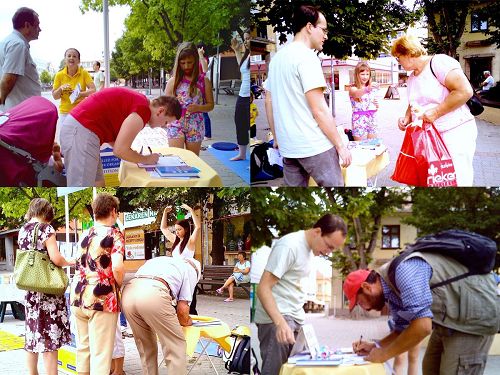 二零一七年七月七日斯洛伐克部份法轮功学员在Nové Zámky市中心广场的一角,拉开真相横幅,有的随着舒缓的炼功音乐演示一至五套功法,有的在给过往路人讲述法轮功在中国大陆被迫害的真相,有的在散发真相传单。当地的斯洛伐克人和不少匈牙利族裔的人路过时,几乎都接过学员手中的真相传单,了解法轮功真相后,纷纷来到征签台前签名表示反对迫害,反对强行活摘法轮功学员器官。