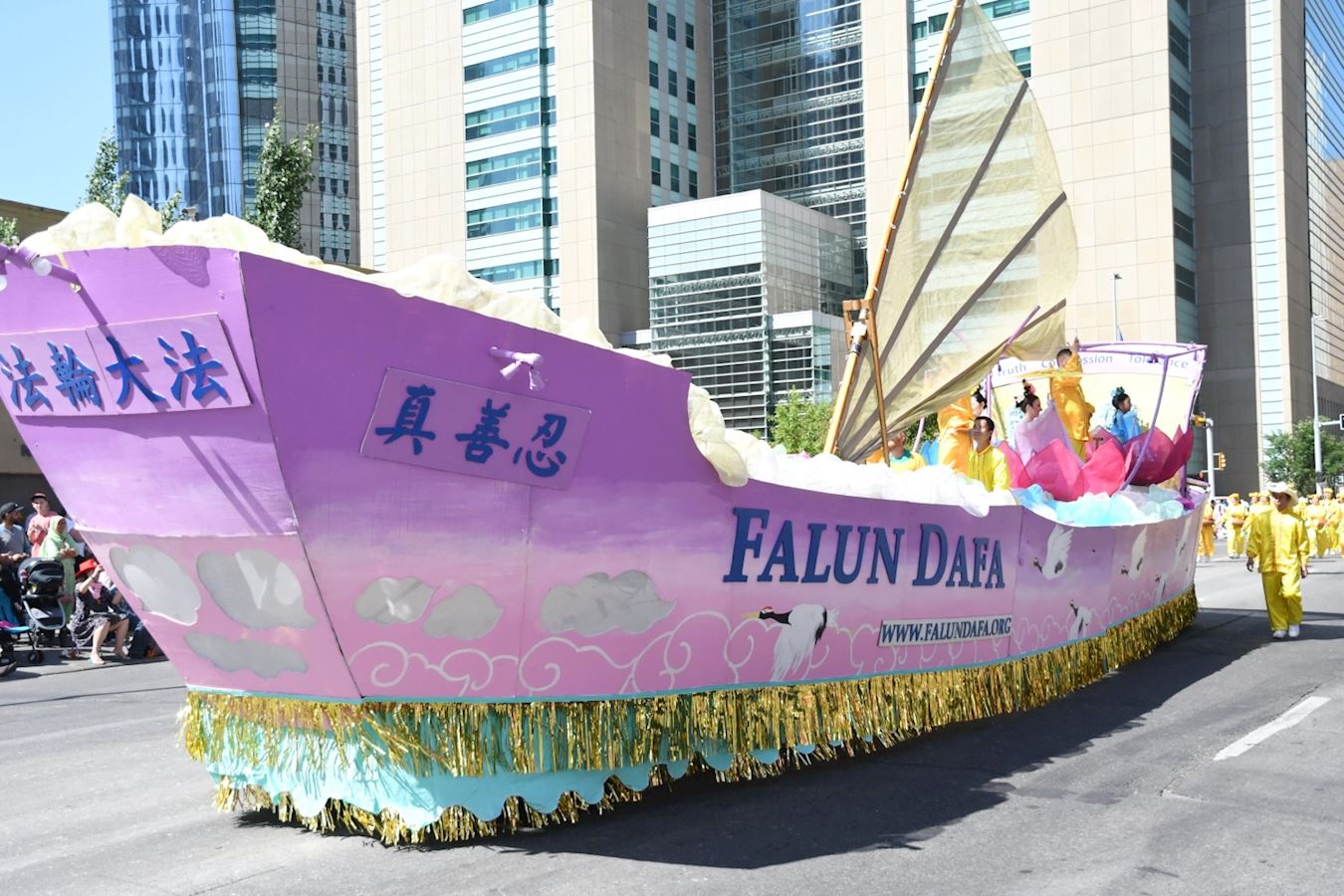 法轮功团体由天国乐团、精美的大法船花车、粉装仙女阵和腰鼓队组成。在两小时的游行中,法轮功的游行队伍给观众带来了美好的视觉和听觉,现场反馈非常热烈。观众们除了在现场报以阵阵热烈的掌声,在其后有机会见到法轮功学员时,热情地招呼道贺。