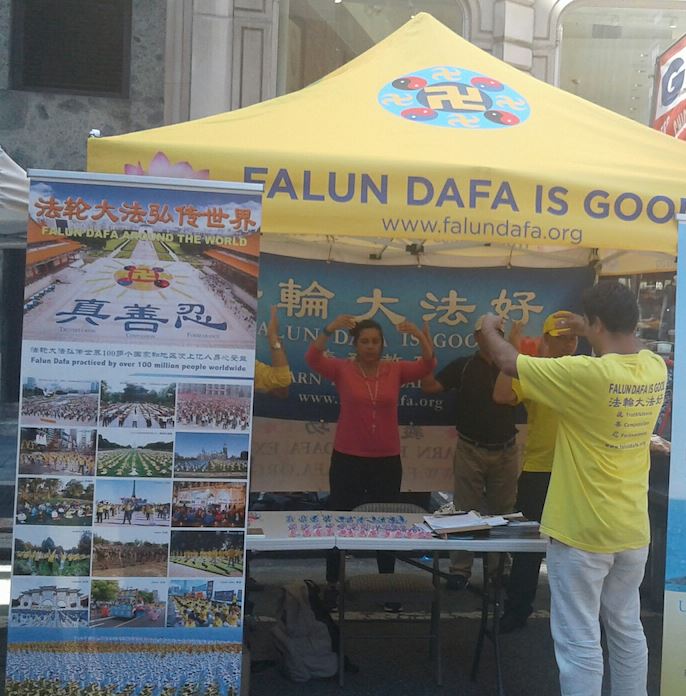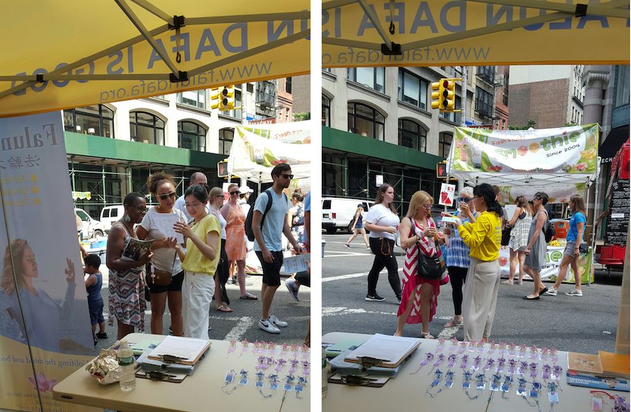 【明慧网二零一七年七月十三日】二零一七年七月二日,纽约曼哈顿联合广场举办了百老汇节(Broadway Festival),延绵五六条街的集市有两百多个摊位,各地美食、衣服及手工艺术品琳琅满目,其中的法轮大法展位中,法轮大法学员们展示缓慢圆的五套功法,纯净的炼功音乐声及精致的小莲花吸引着过往的各地游客和纽约客,学员们热情地跟人们分享法轮大法教人用真、善、忍来做更好的人,加上五套祥和的功法,对精神和身体健康有显著的提高。