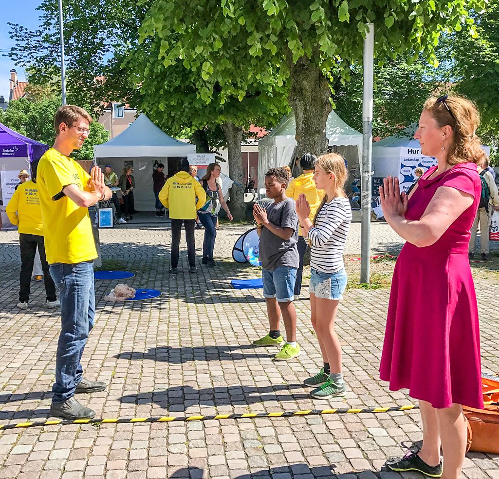 今年法轮功学员们的展位位于一条主要街道上,是所有参观者的必经之路。展位旁边是瑞典媒体中心的重点人物采访台,应邀演讲的各位部长和政要分别到此。法轮功学员正好得以向这些政要展示功法和讲述发生在中国的迫害真相。