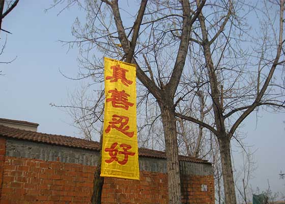 山东省沂水县在大道边挂了近一个月的大型横幅;北京户外真相贴;南昌市郊5.13展板;河北省唐山真相展板