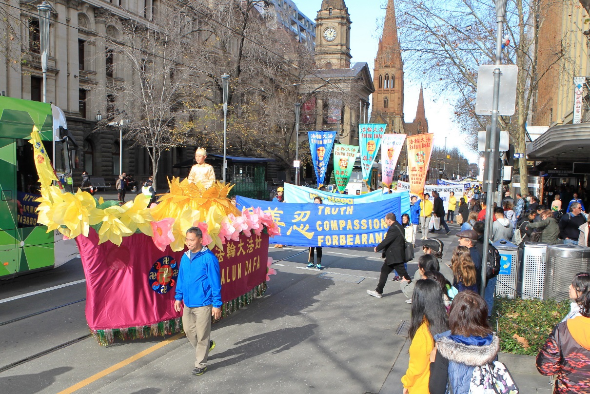 游行从墨尔本市中心的Alexandra Gardens出发,队伍由身着蓝衣白裤的天国乐团引领,嘹亮的军乐声让市民和游人纷纷驻足。紧跟在天国乐团后面的是三个方阵。第一方阵主题为“法轮功好”,展示了巨型法轮功书籍、花车。身着黄色炼功服的法轮功学员还向民众演示了优美、祥和的功法。
