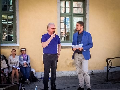 七月六日上午法轮功学员代表图比亚斯(左)在直播现场,接受了瑞典国家电台(Sveriges Radio)的时事与新闻频道P1记者的采访。