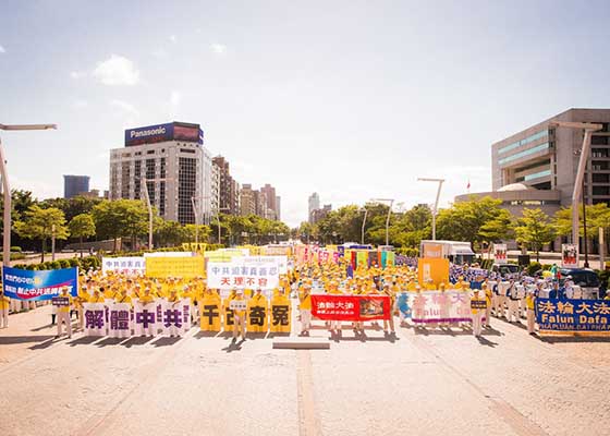 台湾法轮功学员在台北市政府前信义广场举行“法轮功学员反迫害十八周年”大游行,呼吁共同制止中共的邪恶迫害,获得沿途不少市民的认同和支持。