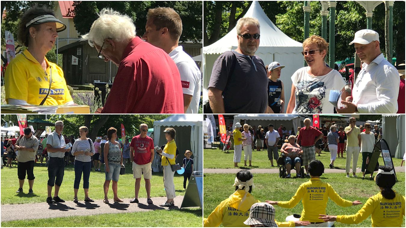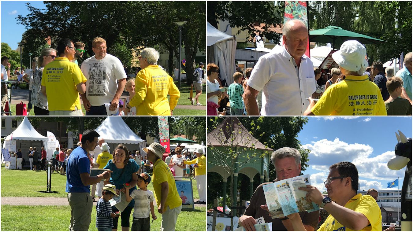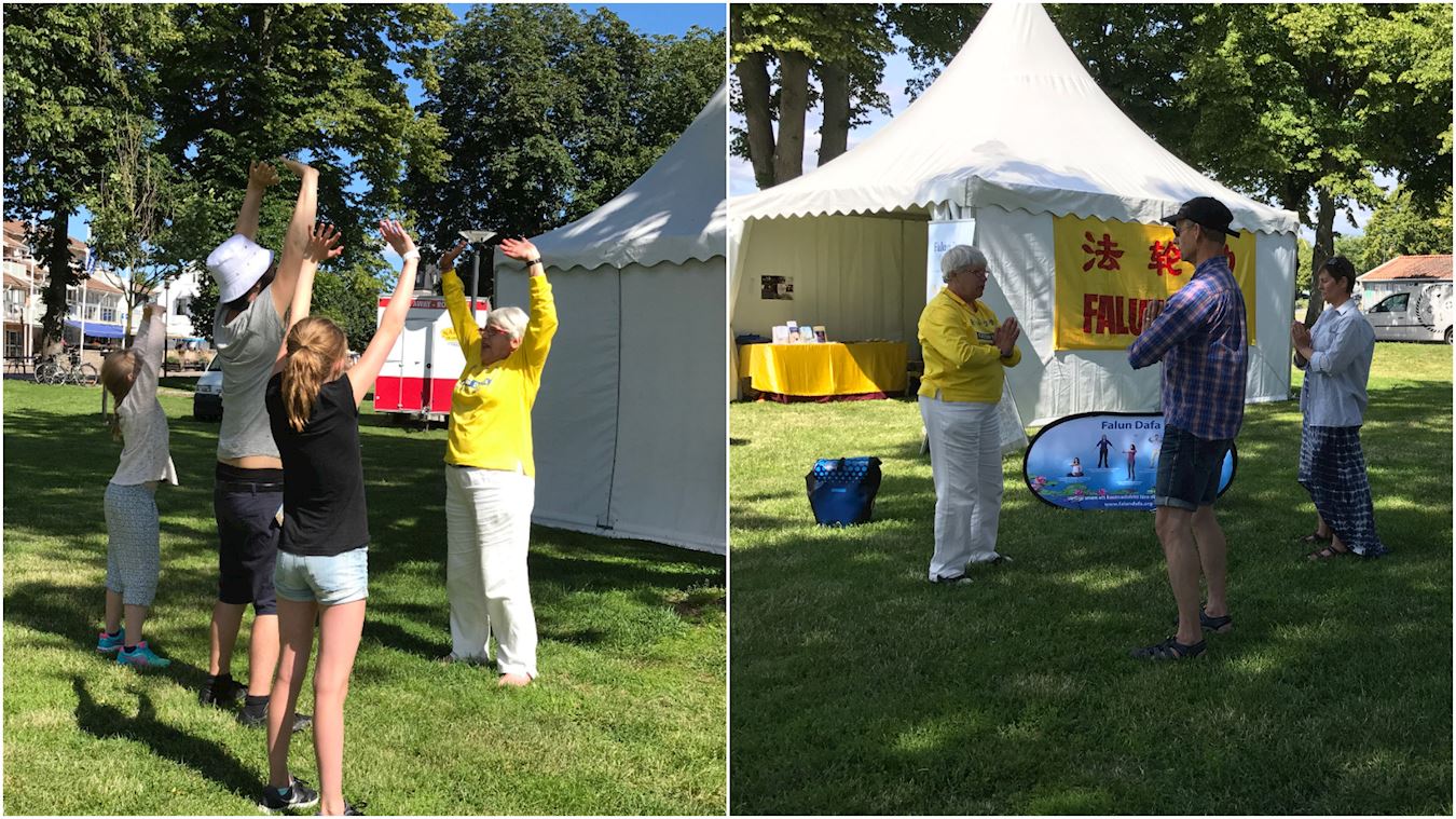 法轮功学员也在这热闹的庆祝活动中搭起了帐篷,为瑞典民众介绍法轮大法,并现场展示功法,义务教功,受到当地民众的欢迎。