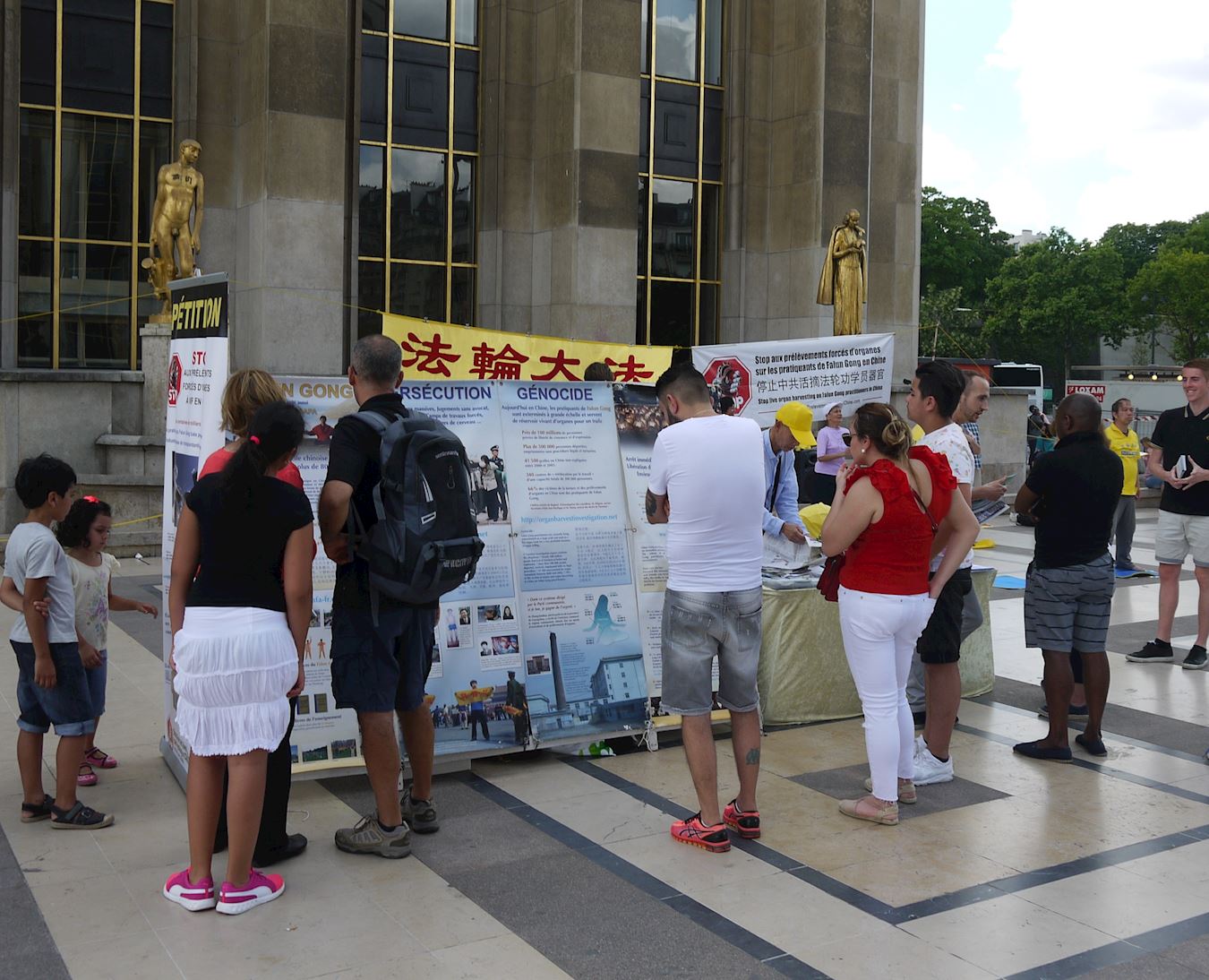 图1~2:巴黎人权广场上,游人驻足了解法轮功真相
