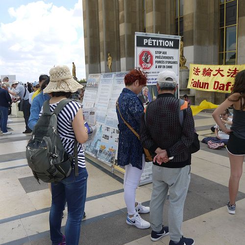 人们在观看功法表演的同时,也了解到,在中国修炼法轮功,会无辜遭到中共当局各种迫害、酷刑折磨,甚至被强行摘取器官。人们无法理解,无法接受这样的事实。他们纷纷在征签表上签字,希望早日结束这场迫害。