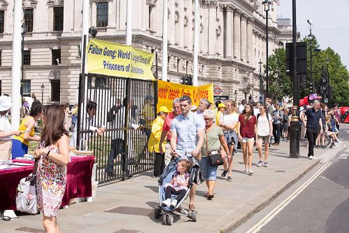 当天经过英议会大厦广场的游客很多,其中不少是中国大陆游客,他们很多人被出现在眼前的真实的法轮功所震撼,很多人对着法轮功活动场地摄影摄像,有些驻足观看,有些接过了真相传单,有的带着惊奇的口吻在嘟囔着:“怎么这也有,国外遍地都是法轮功啊!”