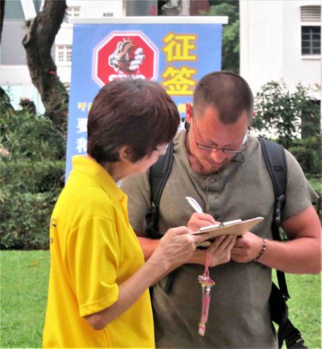 大赦国际的Craig 先生目前在新加坡工作。途经活动现场,他立即就在请愿书上签下名字,并说,因在人权组织工作,对法轮功在中国被迫害的事实非常了解,也曾在香港看过类似的活动。他对法轮功学员反迫害的努力表示支持。
