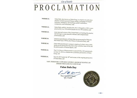 为表示对法轮功学员的支持,西雅图市长爱德华·默里日前颁发褒奖,表彰法轮大法,并宣布二零一七年七月二十日为西雅图市“法轮大法日”。