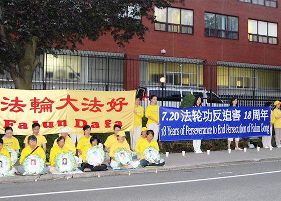 七月二十日晚,多伦多法轮功学员在中领馆前烛光守夜,悼念被中共迫害致死的中国大陆法轮功学员,呼吁各界支持善良、共同结束中共对法轮功的迫害。