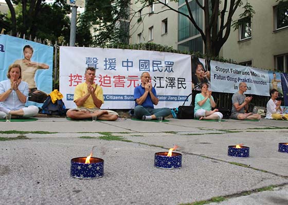 奥地利法轮功学员在首都维也纳的中使馆前举行烛光守夜,悼念十八年来被中共虐杀的中国大陆同修,并呼吁各界共同制止中共暴行。