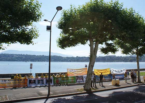 七月二十日,瑞士法轮功学员在联合国人权委员会门前的日内瓦湖畔举行集会,抗议中共对法轮功长达十八年的残酷迫害。