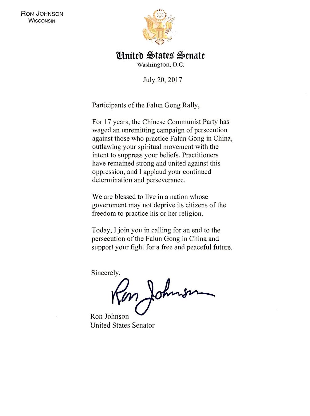 威斯康辛州联邦参议员罗恩·约翰逊(Ron Johnson)表示,他和法轮功学员一起呼吁中共结束对法轮功的迫害,并支持法轮功修炼者为自由和平的未来而奋斗。