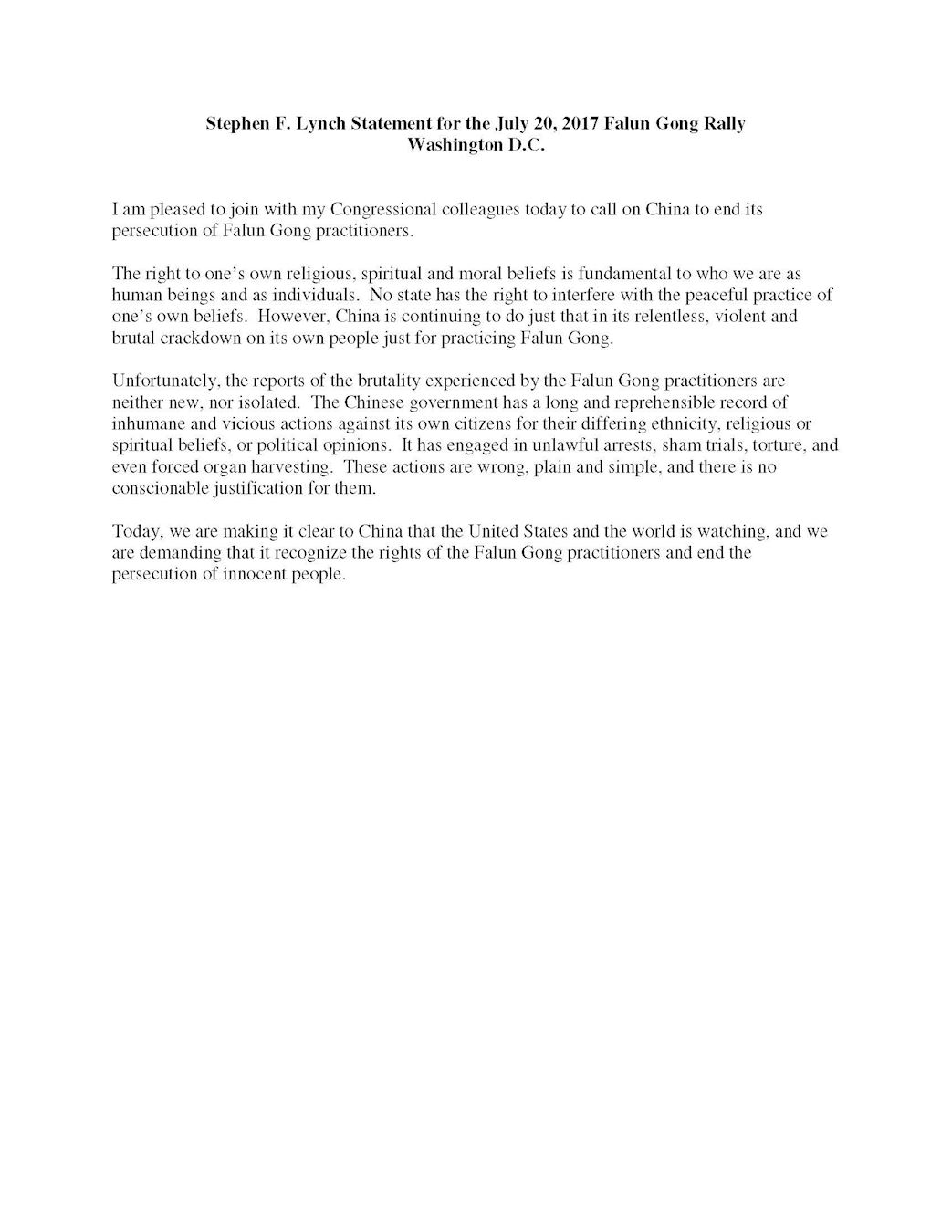 麻萨诸塞州国会议员史蒂芬·林奇(Stephen Lynch)在信中表示,“人,之所以为人,是基于一个人的宗教、精神和道德信仰。没有任何国家有权力干涉个人信仰的和平修炼。然而,中共持续对中国人民施以无情、暴力、野蛮的打压,只是因为这些民众修炼法轮功。”