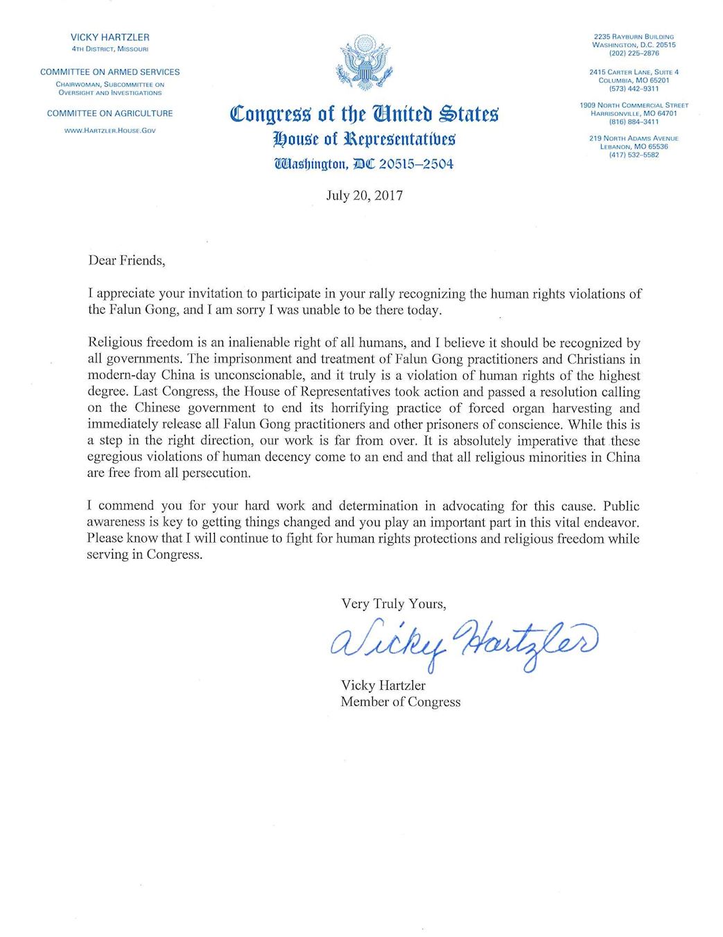 密苏里州国会议员维奇·哈茨勒(Vicky Hartzler)赞赏法轮功学员为争取信仰自由所作出的努力和决心。她表示,在任职期间,会为保护人权和信仰自由不断奋斗。