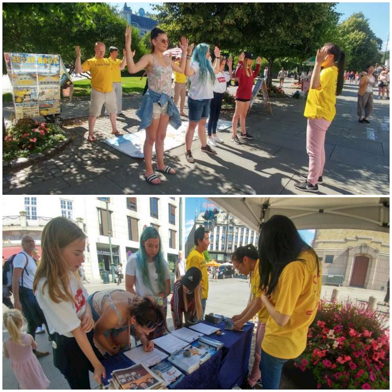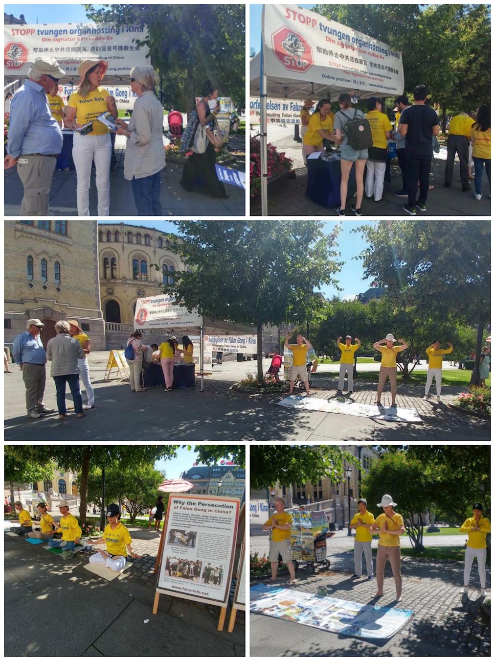 【明慧网二零一七年七月二十三日】二零一七年七月十九日和二十日,挪威法轮功学员在首都奥斯陆举行纪念七二零迫害十八周年的系列讲真相活动,责令中共立即停止对信仰真、善、忍的法轮功群体的残酷迫害、立即法办元凶江泽民及其邪恶团伙。活动中,法轮功学员向民众展示法轮功功法的祥和、美好,并讲述中共迫害法轮功、活摘法轮功学员器官的真相。