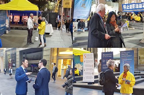 【明慧网二零一七年七月二十三日】(明慧记者华清澳洲悉尼采访报道)在法轮功反迫害十八周年之际,二零一七年七月十九日,在悉尼金融和政界聚集地——马丁广场(Martin Place)上,从晨曦至夜幕降临,法轮功学员在这里向人们讲述法轮功的真相,引起从这里经过的上班族的关注,他们主动询问:发生什么了?知道法轮功被中共非法迫害真相的路人会径直上去签名支持;有的说:我的心和你们在一起!还有的说:法轮功做得好,请坚持下去!祝你们非常如愿成功!