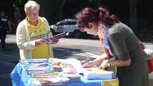 Edith是在看到关于揭露中共活摘罪行的展板后决定签名制止这一罪行的,同时也因为:“我知道这来自中国的功法非常有价值,有深刻的思想内涵。法轮功学员的专注,放松,全心的投入自我,对现在的我们来说非常重要,我也非常惊讶,自己现在才第一次听说(法轮功),我会继续了解更多的讯息。”她也非常认同真善忍,打算先从自身做起。
