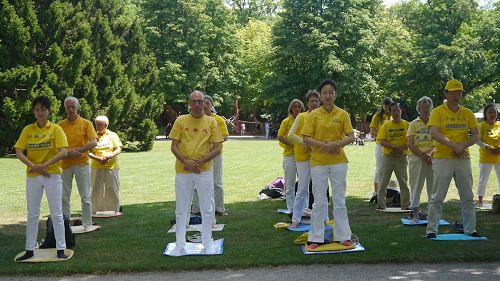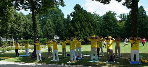 下午,法轮功学员在瑞士景点——玫瑰园(Rosengarten)集体炼功,展示功法。法轮功学员祥和的功法演示成了一道特殊的风景线,吸引了来自各地游客的关注。他们有的跟学员攀谈了解更多的讯息,有的则接过真相杂志,就近坐下仔细阅读。