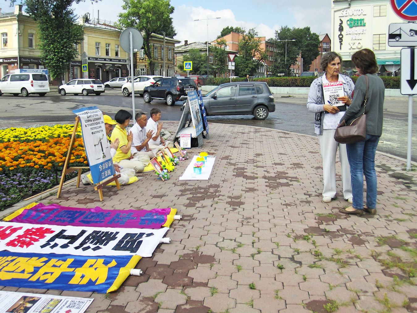 图1~4:二零一七年七月十六日和七月十九日俄罗斯伊尔库茨克市法轮功学员分别在本市沿岸街和中共总领事馆附近举行系列讲真相活动,呼吁制止迫害。许多民众驻足了解,有的并签名支持反迫害。
