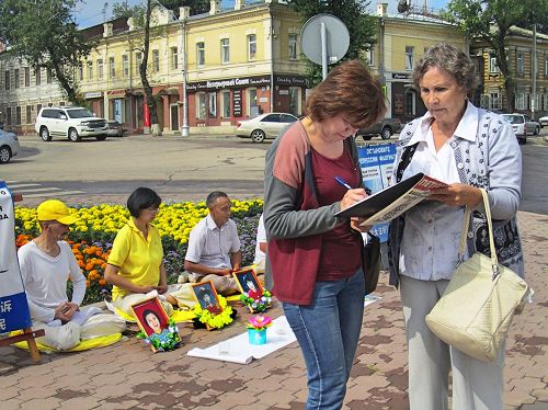 '图1~4:二零一七年七月十六日和七月十九日俄罗斯伊尔库茨克市法轮功学员分别在本市沿岸街和中共总领事馆附近举行系列讲真相活动,呼吁制止迫害。许多民众驻足了解,有的并签名支持反迫害。'