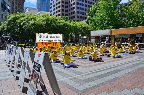 【明慧网二零一七年七月二十五日】二零一七年七月二十二日,来自大西雅图地区的法轮功学员来到西雅图市西湖公园(Westlake Park)集体炼功,通过真相展板向来自世界各地的人们介绍法轮功从传出至今的大事纪和历程,并征集反活摘签名,同时呼吁停止迫害法轮功,法办江泽民。