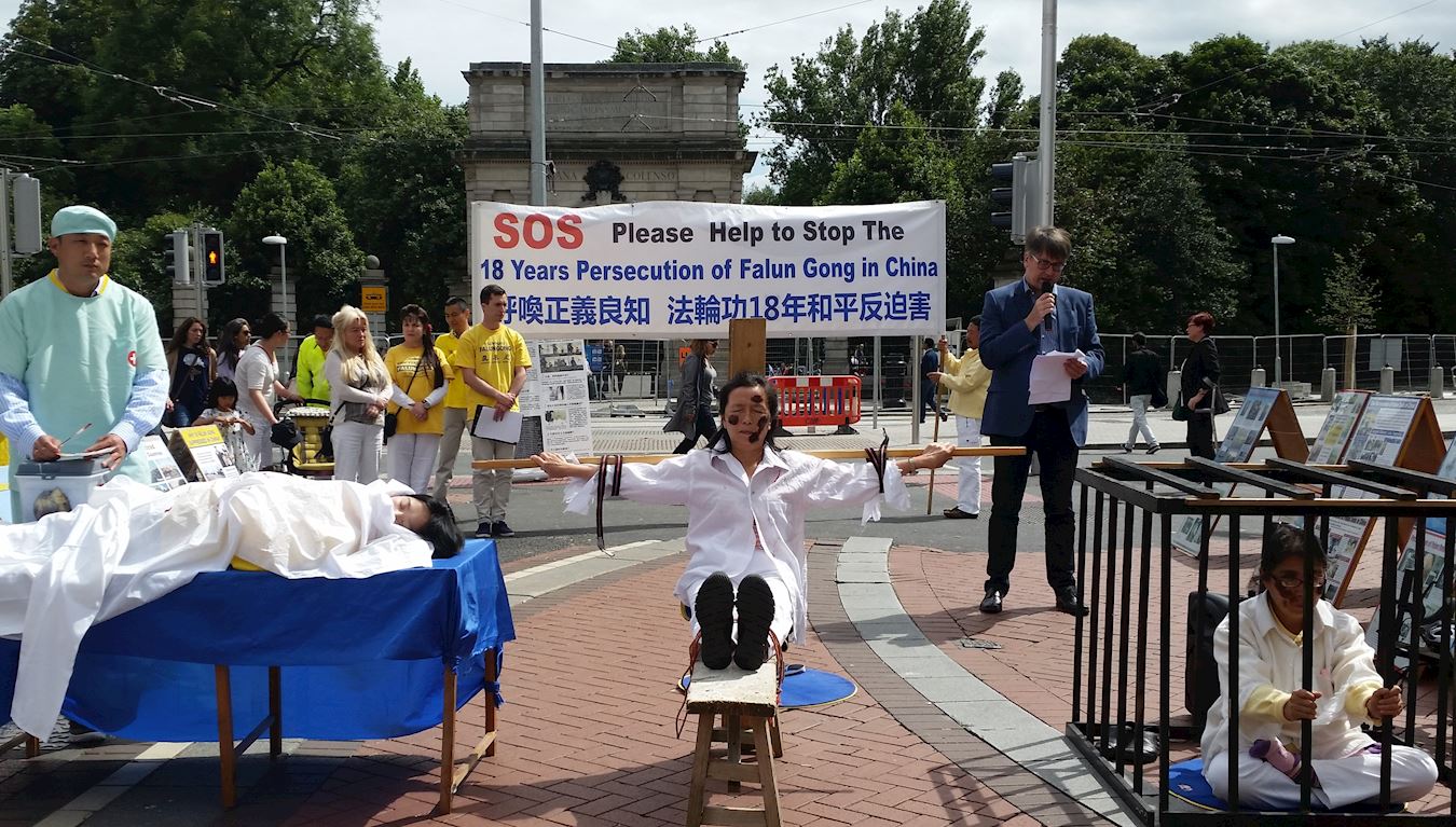 ![]() 图5:法轮功学员以模拟演示揭露中共地酷刑迫害和活摘器官。 |