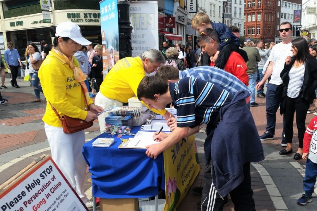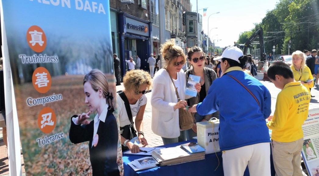 两名游客模样的华人经过法轮功集会摊位时停了下来,当法轮功学员建议他们进行三退时,年龄较大的男子连连说:“早退了,早退了。”这名华人表示前一天在英国伦敦旅游时,当地法轮功学员就已经帮助其办理了三退。他收下了法轮功小学员送给他的印有“法轮大法好”的纸莲花。