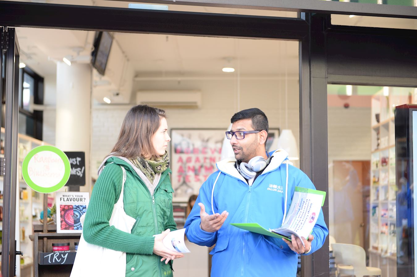 ![]() 图4:Sarah (左)正在聆听法轮功学员介绍法轮大法及受迫害真相 |