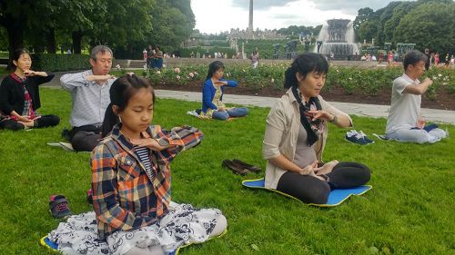二零一七年七月的奥斯陆风和日丽,气候宜人。每年春夏季,来奥斯陆观光旅游的游客络绎不绝。维格兰雕塑公园是游客们必不可少的参观景点之一。挪威法轮功学员每周日下午自发来这里弘法炼功。他们安静、祥和的炼功场面成为雕塑公园一个景观。