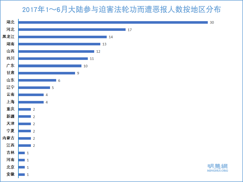 【明慧网二零一七年七月二十九日】据明慧网2017年上半年1月至6月份报道所作的统计,在中国大陆21个省、直辖市包括:安徽、北京、甘肃、广东、河北、河南、黑龙江、湖北、湖南、江西、吉林、辽宁、内蒙古、宁夏、山东、山西、上海、四川、天津、新疆、云南、重庆,都出现因迫害法轮功遭恶报的事件。遭恶报最多的前八名是:湖北30人、河北17人、黑龙江14人、湖南13人、山西12人、四川10人、广东10人、甘肃9人等等。