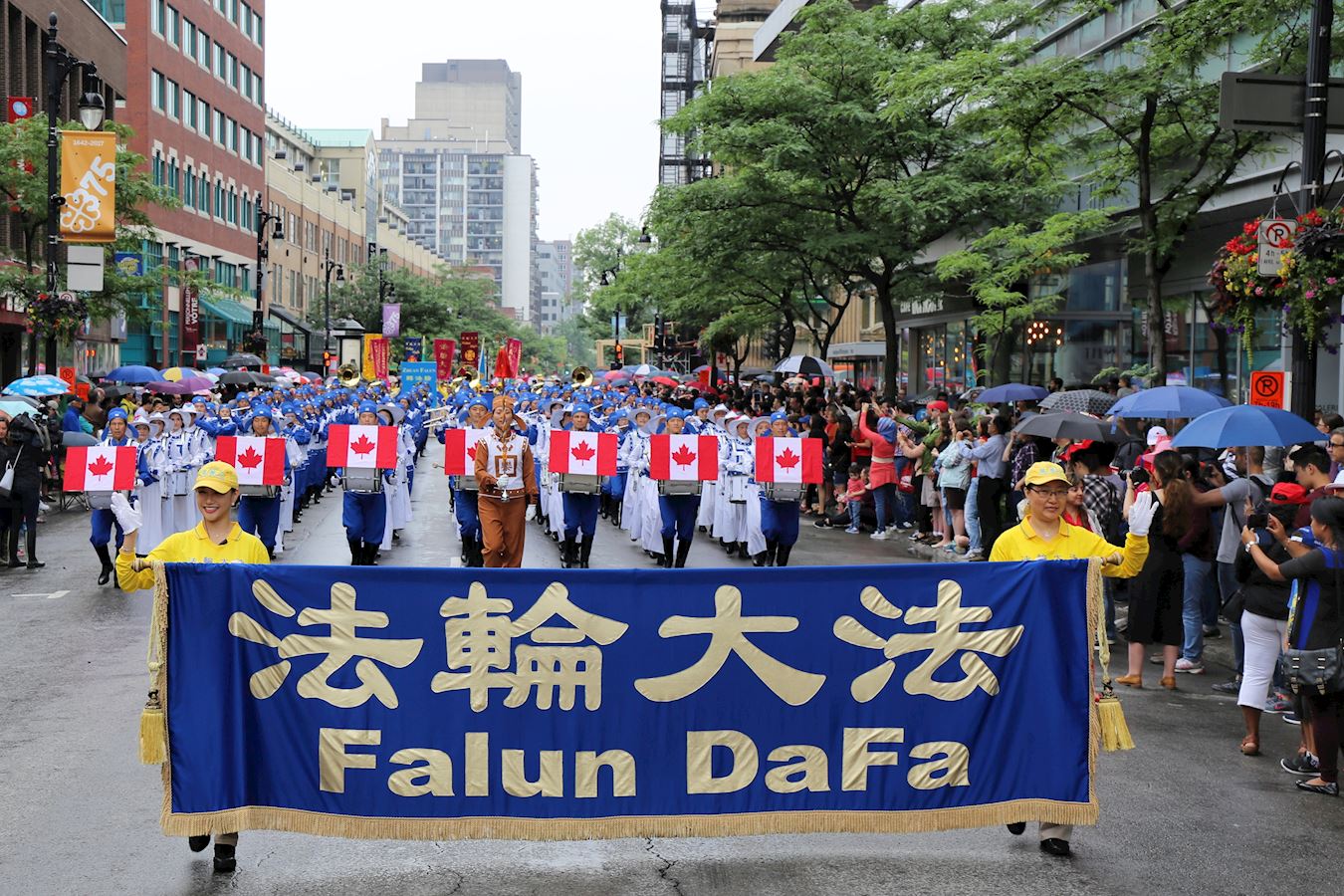 '法轮大法天国乐团,和旌旗、炼功队伍的法轮功学员共250多人应邀参加了蒙特利尔7月1日举办的加拿大国庆游行,受到东、西方观众盛赞。'