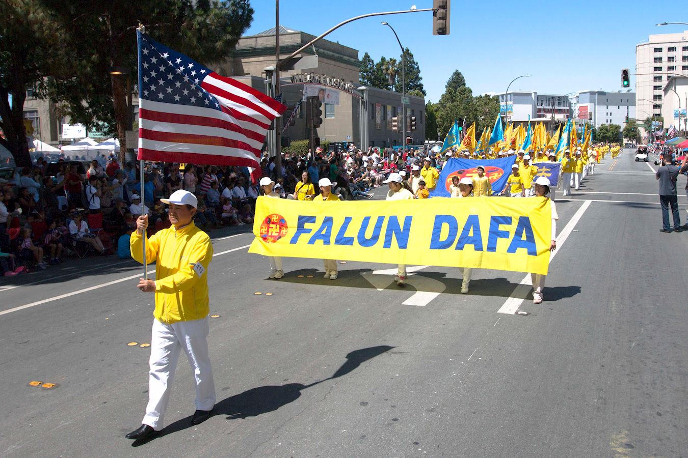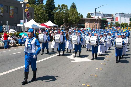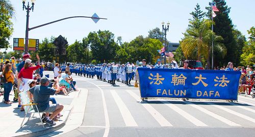 法轮功学员的游行方队由美西天国乐团、旌旗队、炼功队、腰鼓队、舞蹈队和花车组成。今年是腰鼓队第一次参加红木城游行。这次参加红木城游行的法轮功方阵是历年来最大的,气势磅礴。所到之处,人们禁不住鼓掌欢呼、为法轮功的队伍叫好。