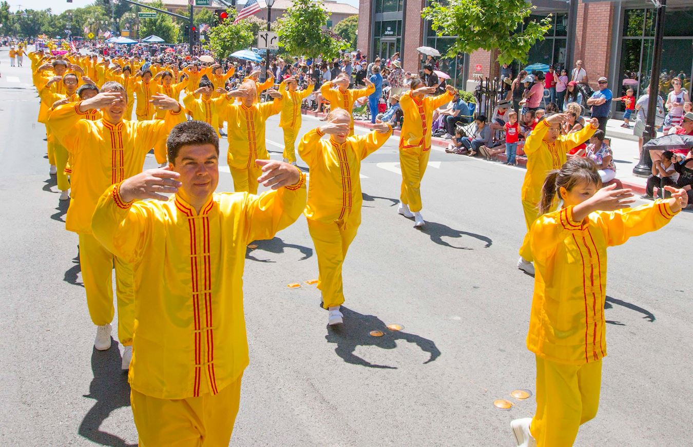 图19:在美国出生长大、自幼修炼法轮功的伍爱莲(左一)每年都来参加红木城国庆日游行,告诉民众:法轮大法好。