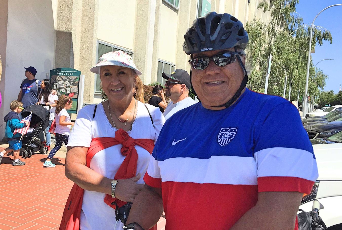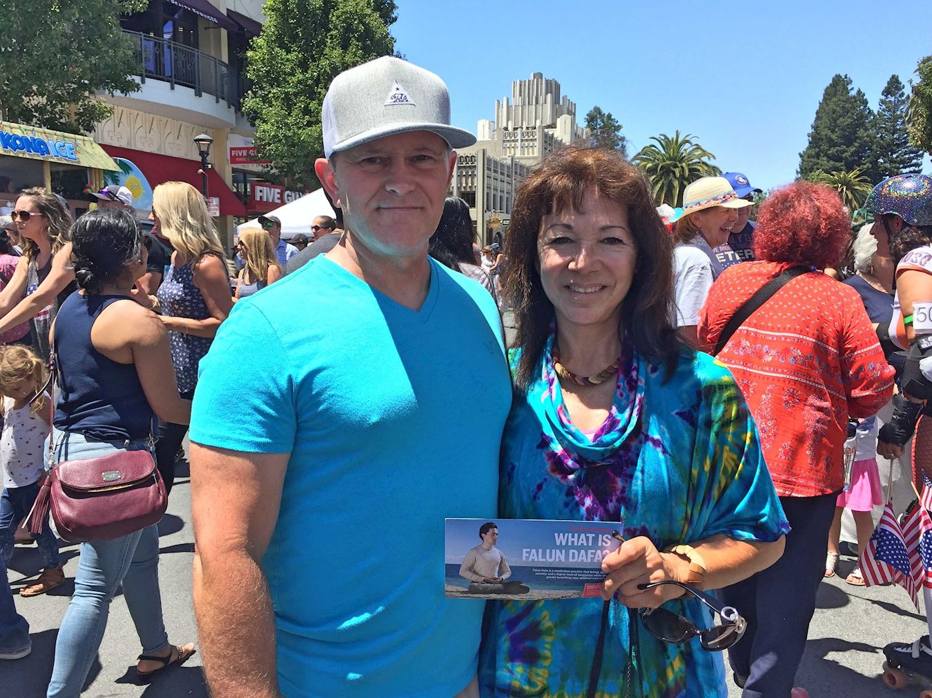 湾区居民Cynthia 和Ed跟随着“法轮大法好”的音乐和拍子,太太则模仿法轮功学员的炼功动作,Ed不断说:“太美了,太美了。” 太太辛西娅开心的说:“看着他们亮丽的黄色的服装,就让人感到很舒服,很美好。”当被问到在模仿法轮功学员的炼功动作是什么感觉时,她说:“感觉非常平和与放松,感觉很好。”