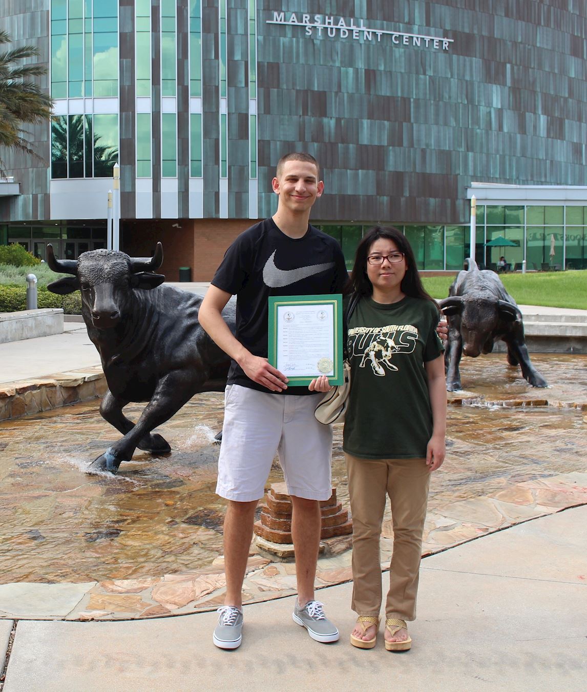 ![]() 图1:南佛罗里达大学学生政府参议员斯宾塞·泰特(Spencer Tate)和本校员工鲁苑青(右)手持南佛州大学学生政府通过的决议案 |