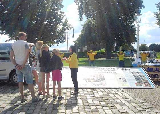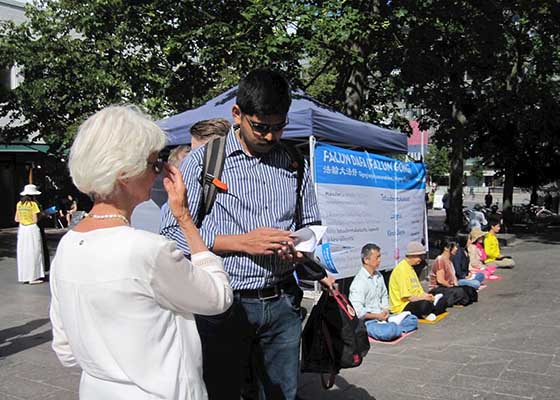 芬兰法轮功学员在首都赫尔辛基举办信息日活动,吸引不少游客前来了解功法和发生在中国的迫害详情。