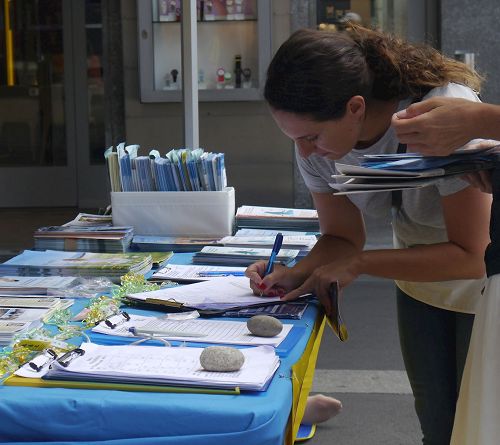 在苏黎世大学政治经济系就读的凯撒(Caesar)在路过时主动停下了解更多的讯息。他认为中共活摘器官的罪行:“非常清楚,对我而言是完全不能容忍的。征签让人来关注这件事,是一件好事,我支持征签。”他希望通过自己的签名“可以让更多人来关注这一切,在联合国也能对此展开讨论,能制止这场迫害。”