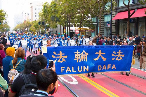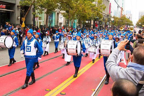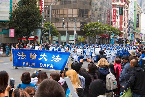 游行从上午十一点开始,游行路线和去年一样,从市民中心(Civic Center)沿着市场街一直走到芳草地公园(Yerba Buena Gardens)。天国乐团为观看游行的民众带来了《法轮大法好》、《神圣的歌》和《星条旗永不落》等乐曲,让观众耳目一新。