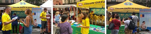 法轮功学员利用周末的休息时间也来参与这个社区集市,义务向各国游客和居民介绍法轮功提高身心健康的显著效果。参加活动的每一位学员都受益于这个传统的中国打坐修炼功法,修炼让他们疾病痊愈,改变了不良的生活方式,有更加积极的生活态度,他们希望人们能了解这个美好的功法及其在中国无辜遭受的迫害,共同制止中共暴行。