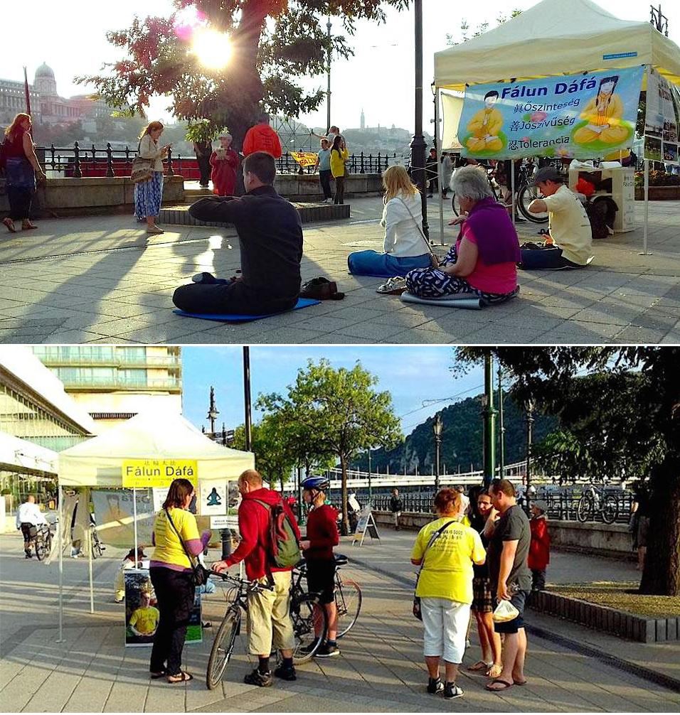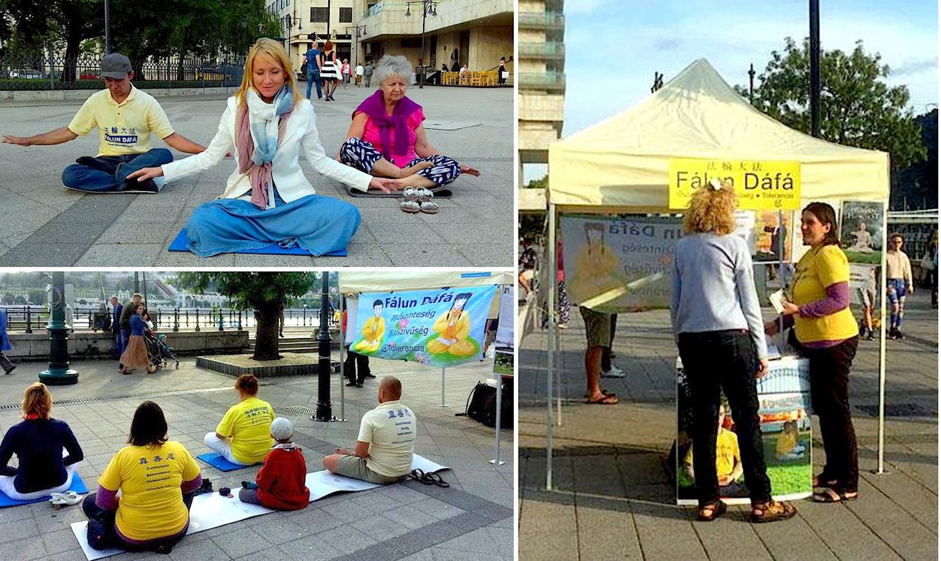 二零一七年七月二十日,匈牙利学员于法轮功反迫害十八周年之际,来到中共大使馆前和平静坐,谴责迫害,要求把迫害元凶江泽民绳之以法,立即停止迫害法轮功。第二天在市中心多瑙河旁举行了讲真相的活动,呼吁人们携手共同制止中共的暴行,停止迫害法轮功。